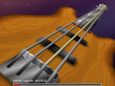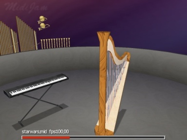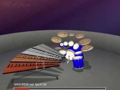 MIDIJam is a program that visualizes MIDI files as they are played. Eventually I hope to support all the instruments. This is a page detailing what I have included this far, and what is still yet to come. As you can see, a lot is visually shown now, and there is a lot more yet to be done. I will probably try and do the percussion stuff and more "visualized but not simulated" instruments, where a representation of something playing the notes shows up, and hopefully it shows a different reaction for each note of the scale A through G plus sharps and flats, but doesn't show seperate octaves or accurate fingering. |